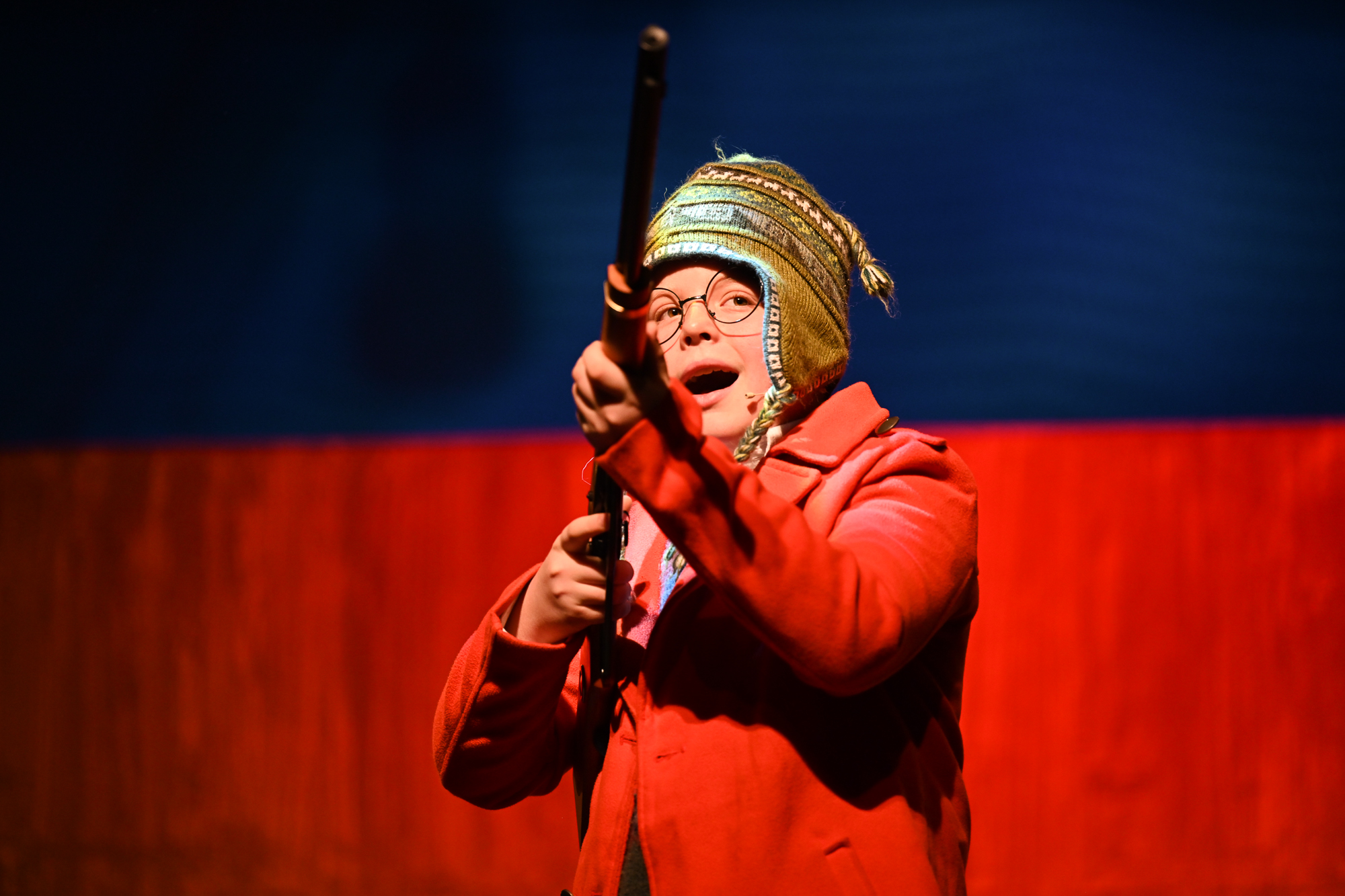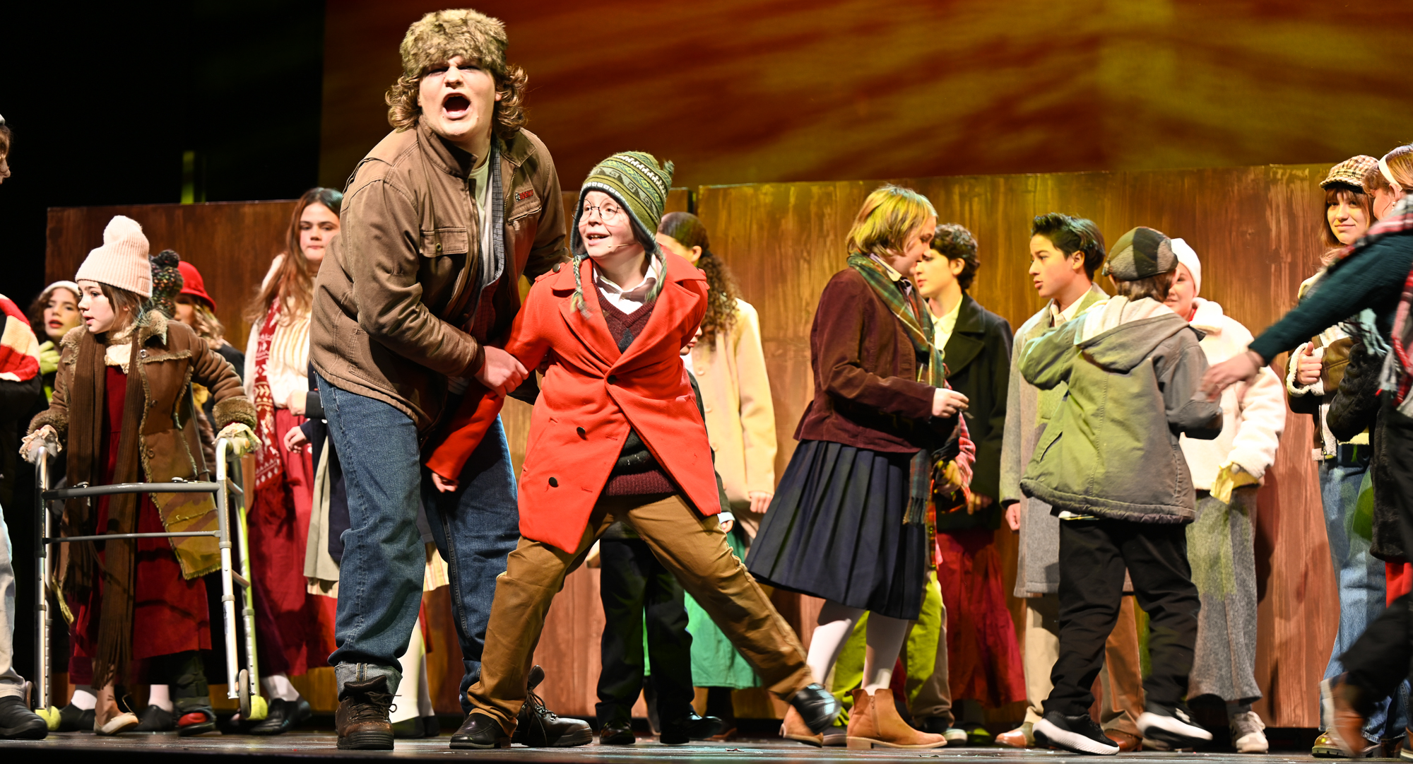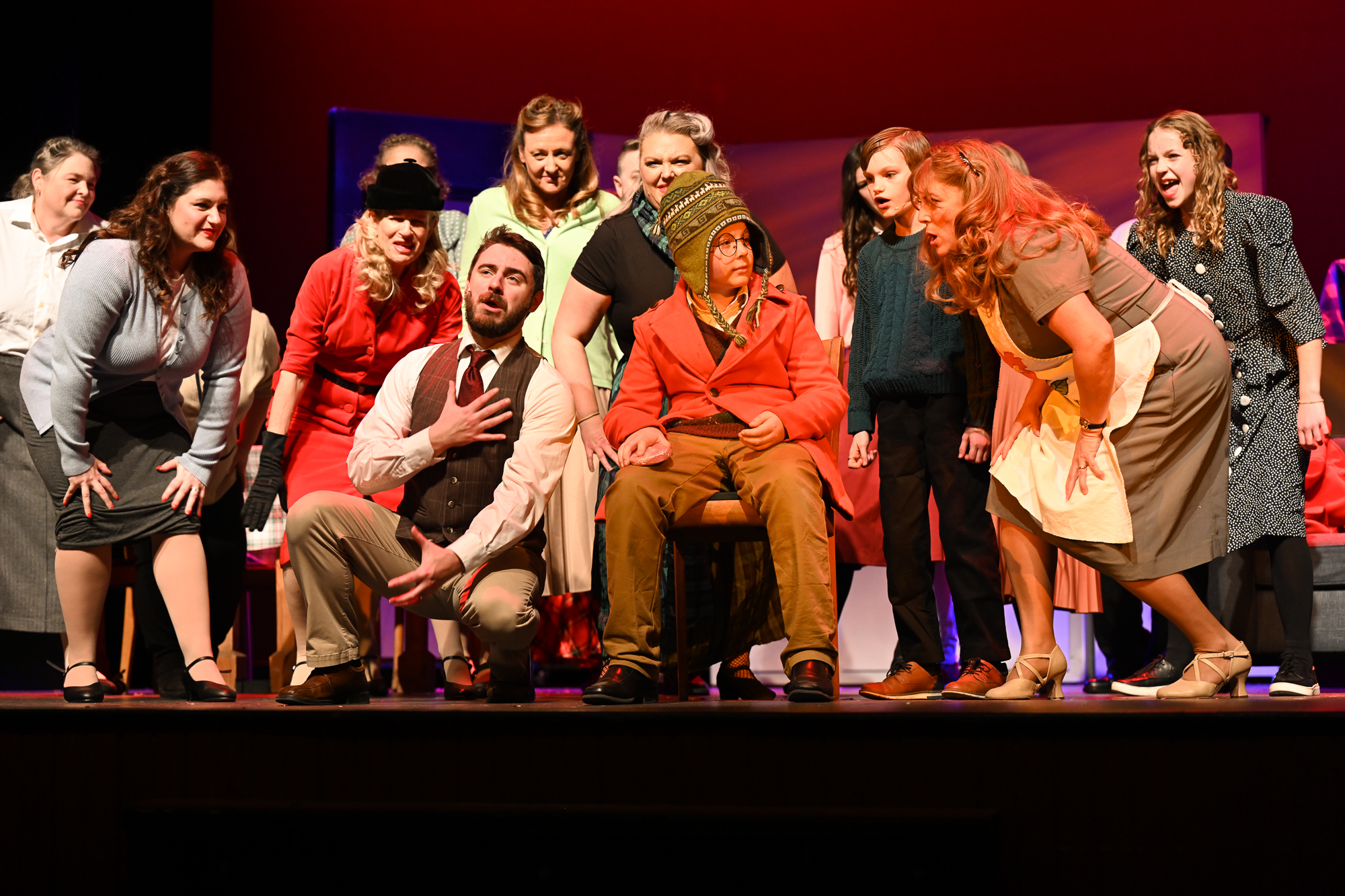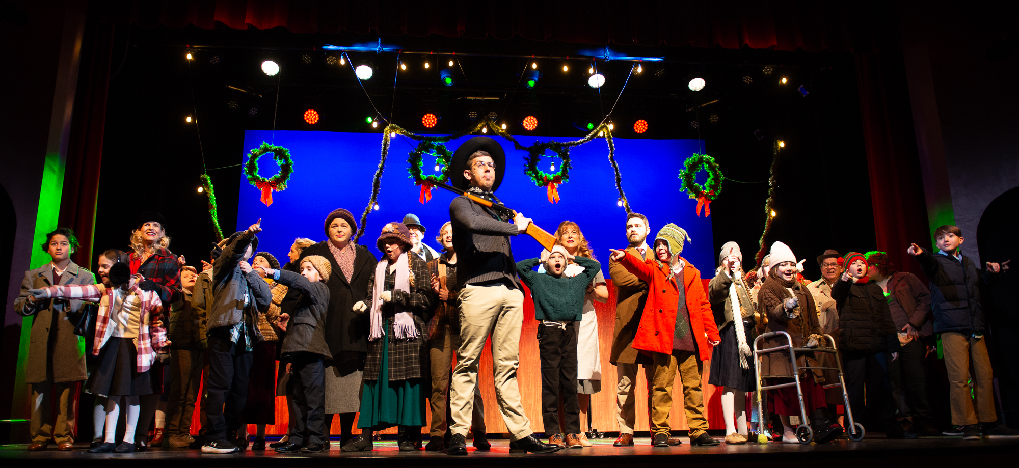 Brittan Posey (Jean Sheperd/Narrator) Charlie Schwallie-deTar (Ralphie) Kevin Kunz (The Old Man) Jan McGarry (Mother) Wilbur Walter-Groll (Randy) Melanie Tullett (Miss Shields) Al Morar (Santa) Ro Remnant (Flick) Lochlin Seurkamp (Schwartz) Alice Riggins (Esther Jane) Cassie Saner (Mary Beth) Leo Grose (Grover Dill) Jacob Varner (Scut Farkus) Children Ensemble (Audrey Morar, Calvin Epley, Clement Liu, Eden Andrews, Edwin Young-Ihling, Felecia Johnson-Flores, Hadley Bell, Isabelle Dellinger, Jasmine Levering, JoJo Bew, Jordyn Higgins, Jude Haviland Colagiovanni, Luke Hashman, Millie Tullett, Nate Hockman, Quinn Duquette, Reagan James, Roland Seurkamp, Stella Bell) Teen Ensemble (Briella Shay, Delaney Cochran, Katya Dobrynin, Lilian Ray, Lillian Morar, Lola Cornett, Lucy Dodd, Mikaela Higgins, Piper Smeck, Raphael Johnson-Flores) Adult Ensemble (Andrea Thompson-Hashman, Bette Morar, Carolyn Harding, Gabrielle Blackwood Johnston, Joanna Mansfield-Duquette, Joe Balding, Katie Chaney, Megan Cameron, Michael Dailey, Nic Joseph Saul, Rita Preston, Samantha Kunz, Stuart Yaden) |